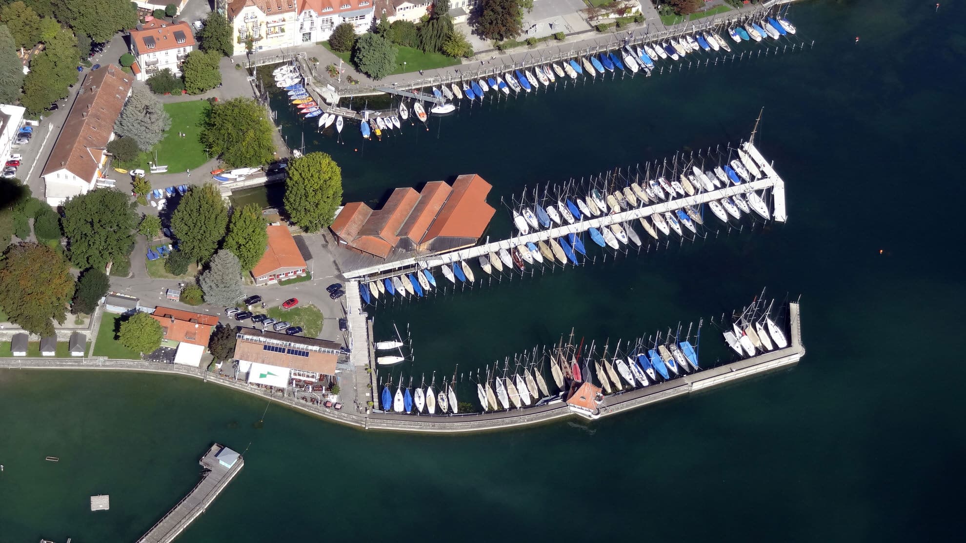 Der Hafen des LSC ist heute eine historisch gewachsene Anlage mit 110 Wasserliegeplätzen und 50 Jollenplätzen an Land.